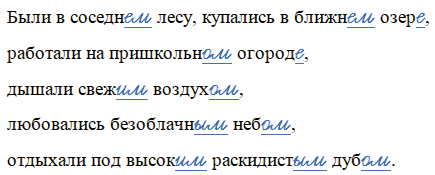 Были в (каком?) соседнем лесу (П. п., 2-е скл.), купались в (каком?) ближнем озере (П. п., 2 скл.), работали на (каком?) пришкольном огороде (П. п., 2-е скл.), дышали (каким?) свежим воздухом (Т. п., 2-е скл.), любовались (каким?) безоблачным небом (Т. п., 2-е скл.), отдыхали под (каким?) высоким раскидистым дубом (Т. п., 2-е скл.).