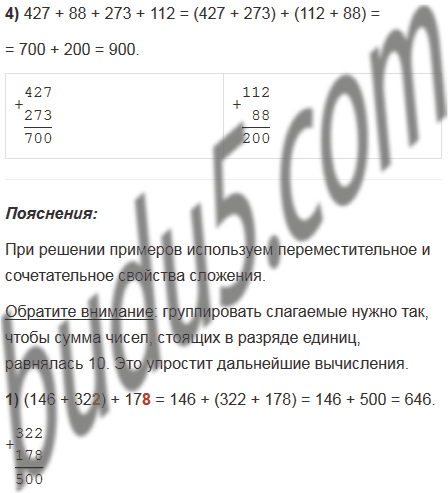 1) (146 + 322) + 178; 3) 625 + 481 + 75 + 219;