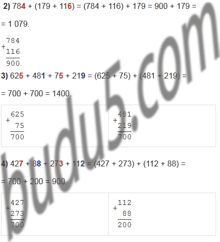 2) 784 + (179 + 116); 4) 427 + 88 + 273 + 112.