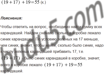 В коробке лежали синие и зелёные карандаши. Зелёных карандашей было 19, что на 17 меньше, чем синих. Сколько всего карандашей было в коробке?