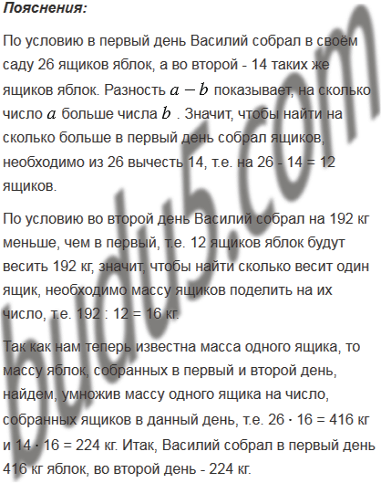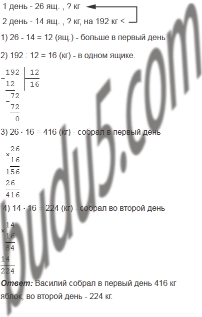 В первый день Василий собрал в своём саду 26 ящиков яблок, а во второй - 14 таких же ящиков яблок. Сколько килограммов яблок собрал Василий в первый день и сколько - во второй, если во второй день он собрал на 192 кг меньше, чем в первый?