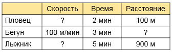2) По полученным данным построй диаграмму скорости пловца, бегуна и лыжника, обозначая скорость 10 м/мин одной клеткой.