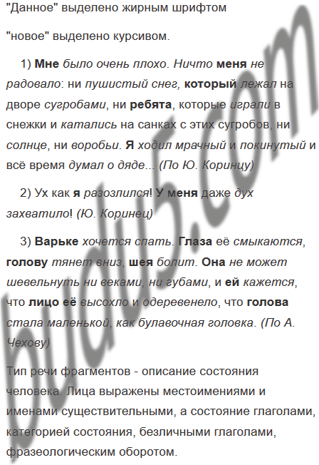 Найдите в текстах «данное» и «новое». Что они обозначают? Определите тип речи этих фрагментов. Какими частями речи выражено лицо (носитель состояния) и его состояние?