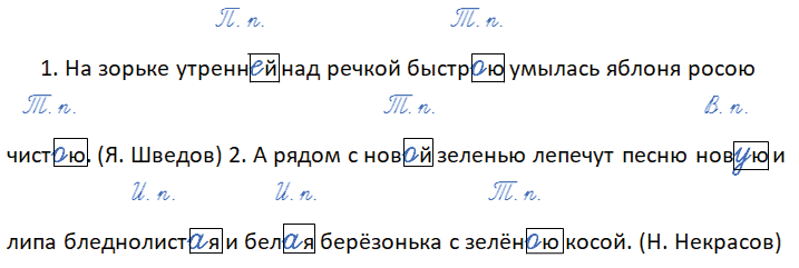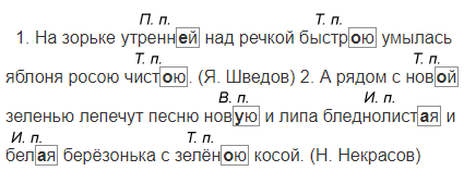 1. На зорьке утренн_й над речкой быстр_ю умылась яблоня росою чист_ю. (Я. Шведов) 2. А рядом с нов_й зеленью лепечут песню нов_ю и липа бледнолист_я и бел_я берёзонька с зелён_ю косой. (Н. Некрасов)