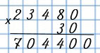 Выполняем действия по алгоритму умножения трёхзначного или многозначного числа на однозначное, не обращая внимания на нули, а затем приписываем в произведении то количество нулей, которое было в конце множителей.