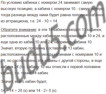 Кабинки развлекательного аттракциона "Колесо обозрения" (рис. 68) последовательно пронумерованы числами 1, 2, 3 и т.д. Сколько всего кабинок, если известно, что когда кабинка с номером 24 занимает самую высокую позицию, то кабина с номером 10 - самую низкую?
