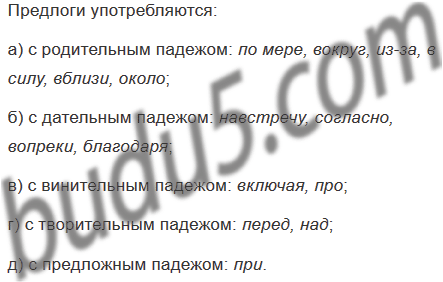 1. Сгруппируйте предлоги, которые употребляются: а) с родительным падежом; б) с дательным; в) с винительным; г) с творительным; д) с предложным.
