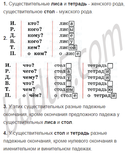 3. Сравните склонение существительного лиса со склонением существительных стол и тетрадь. В чём сходство и различие?