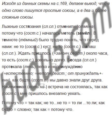 1. Рассмотрите ещё раз схему на с. 169. Сделайте вывод, какие союзы (простые, составные) пишутся в одно слово, а какие — в два и более. Запишите свои вывод.