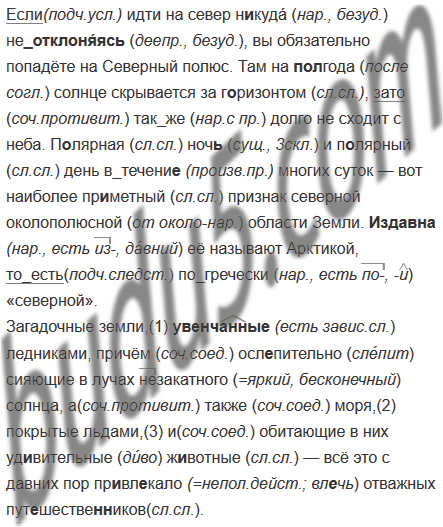 Если идти на север н..куда (н..) отклоняясь, вы обязательно попадёте на Северный полюс. Там на (пол) года солнце скрывается за г..ризонтом, (за) то так (же) долго не сходит с неба. П..лярная но(ч, чь) и п..лярный день (в) течени.. многих суток — вот наиболее пр..метный признак северной (около) полюсной области Земли. Изд..вн.. её называют Арктикой, (то) есть (по) гречески «северной».