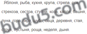 Яблоня, дверь, рыба, сноп, кухня, крупа, стрела, овёс, оса, комар, стрекоза, столяр, сестра, ступня, коза, капля, башня, луна, гора, месяц, гиря, шуба, конь, овца, деревня, стая, струя, пустыня, медведь, роща, небо, снег, неделя, дыня.