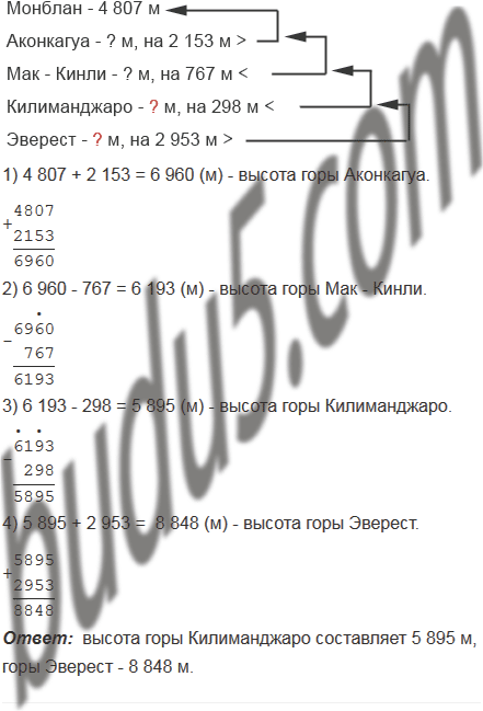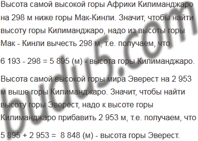 Высота самой высокой горы Европы Монблан равна 4 807 м. Она на 2 153 м ниже самой высокой горы Южной Америки Аконкагуа, которая на 767 м выше самой высокой горы Северной Америки Мак-Кинли. Какова высота самой высокой горы Африки Килиманджаро, если она на 298 м ниже горы Мак-Кинли? Какова высота самой высокой горы мира Эверест (рис. 112), если она на 2 953 м выше горы Килиманджаро?