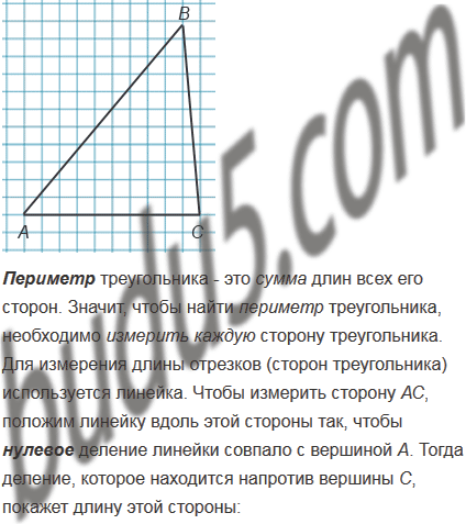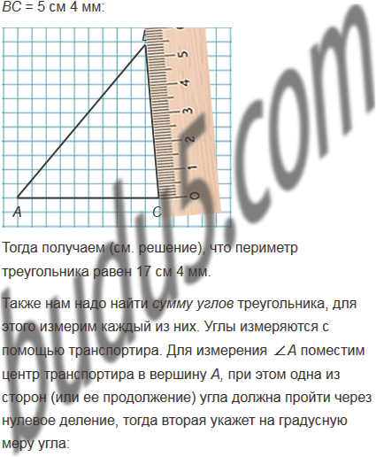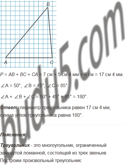 Начертите произвольный треугольник, измерьте его стороны и углы, найдите периметр и сумму углов этого треугольника.