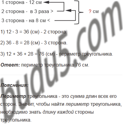 Одна сторона треугольника равна 12 см, вторая сторона в 3 раза больше первой, а третья - на 8 см меньше второй. Найдите периметр треугольника.