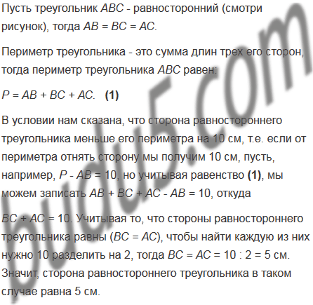 Найдите сторону равностороннего треугольника, если она меньше его периметра на 10 см.