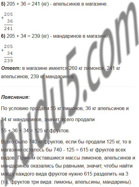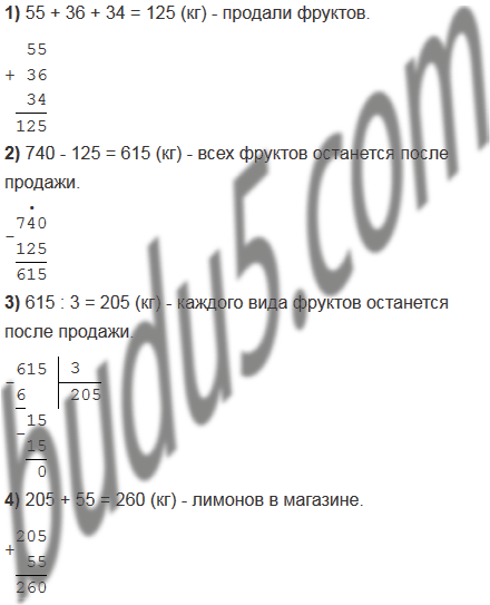 В магазине имеются лимоны, апельсины и мандарины, всего 740 кг. Если бы продали 55 кг лимонов, 36 кг апельсинов и 34 кг мандаринов, то оставшиеся массы лимонов, апельсинов и мандаринов оказались бы равными. Сколько килограммов фруктов каждого вида имеется в магазине?