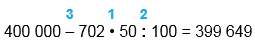 | 400 000 - 702 • 50 : 100 = 399 649 | |