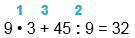 1) 9 • 3 = 27 2) 45 : 9 = 5 3) 27 + 5 = 32 |