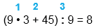 1) 9 • 3 = 27 2) 27 + 45 = 72 3) 72 : 9 = 8 |