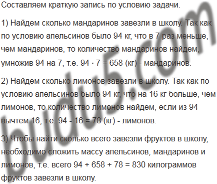 В школу завезли апельсины, мандарины и лимоны. Апельсинов было 94 кг, что в 7 раз меньше, чем мандаринов, и на 16 кг больше, чем лимонов. Сколько всего килограммов фруктов завезли в школу?