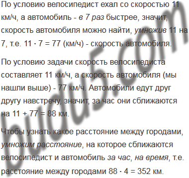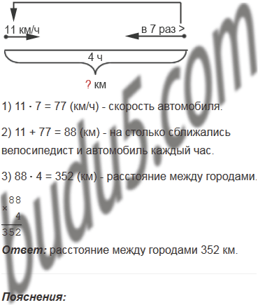 Из двух городов одновременно навстречу друг другу выехали велосипедист и легковой автомобиль. Велосипедист ехал со скоростью 11 км/ч, а автомобиль - в 7 раз быстрее. Найдите расстояние между городами, если велосипедист и автомобиль встретились через 4 ч после начала движения.