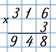 Умножаю единицы: 7 • 7 = 49. 49 ед. - это 4 дес. и 9 ед., 9 ед. пишу под десятками, а 4 дес. запомню и прибавлю к десяткам после умножения единиц.