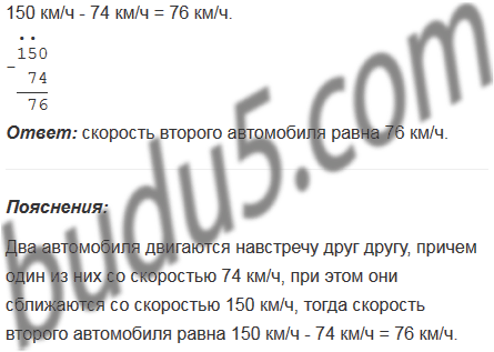 Два автомобиля двигаются навстречу друг другу, причем один из них со скоростью 74 км/ч. Чему равна скорость второго автомобиля, если они сближаются со скоростью 150 км/ч?