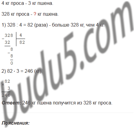 Было собрано 328 кг проса. Сколько из этого проса можно получить пшена, если из 4 кг проса получается 3 кг пшена?