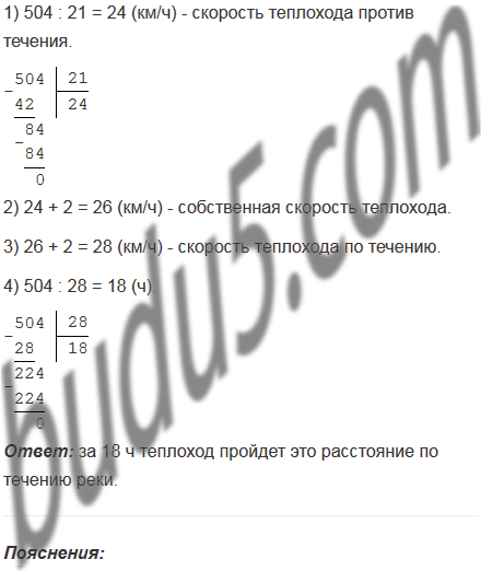 Расстояние между двумя портами равно 504 км. Двигаясь против течения реки, теплоход проходит это расстояние за 21 ч. За сколько часов он пройдет это расстояние по течению реки, если скорость течения равна 2 км/ч?