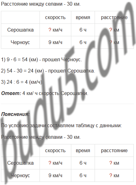 Расстояние между селами Грушевое и Яблоневое равно 30 км. Из этих сел одновременно в одном направлении отправились казаки Серошапка и Черноус. Черноус скакал на коне со скоростью 9 км/ч и через 6 ч после начала движения догнал Серошапку, который шел пешком. С какой скоростью шел Серошапка?