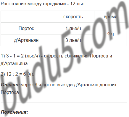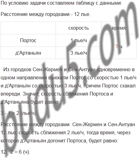 Расстояние между городками Сен-Жермен и Сен-Антуан равно 12 лье (старинная французская единица длины, 1 лье приблизительно равно 4 444 м). Из этих городков одновременно в одном направлении выехали Портос со скоростью 1 лье/ч и д'Артаньян со скоростью 3 лье/ч, причем Портос скакал впереди. Через сколько часов после выезда д'Артаньян догонит Портоса?