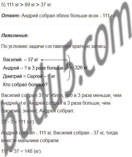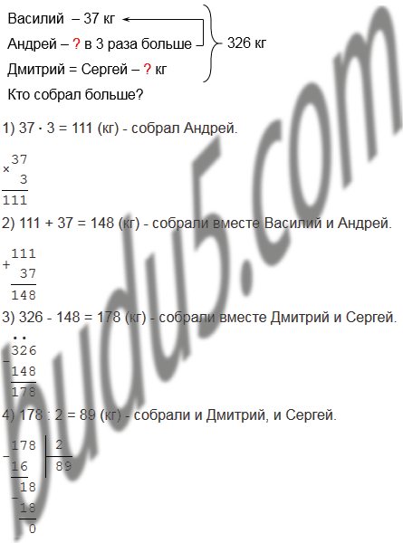 Школьники Василий, Андрей, Дмитрий и Сергей собрали 326 кг яблок. Василий собрал 37 кг яблок, что в 3 раза меньше, чем Андрей, а Дмитрий и Сергей собрали яблок поровну. Кто из школьников собрал больше килограммов яблок?