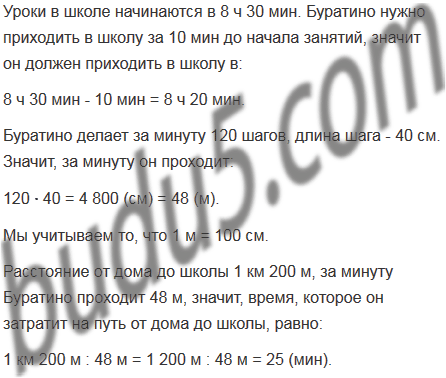 Буратино живет на расстоянии 1 км 200 м от школы. Уроки в школе начинаются в 8 ч 30 мин. Буратино делает за минуту 120 шагов, длина шага - 40 см. В котором часу Буратино должен выходить из дома, чтобы приходить в школу за 10 мин до начала занятий?
