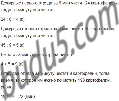 Дежурные первого отряда за 6 мин чистят 24 картофелины, а дежурные второго отряда за 9 мин - 45 картофелин. За сколько минут совместной работы они почистят 198 картофелин?