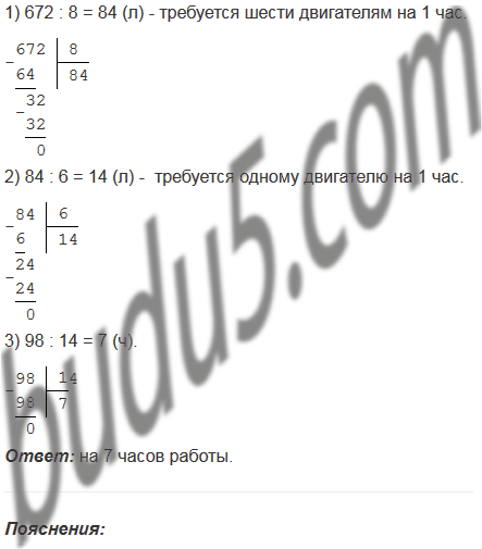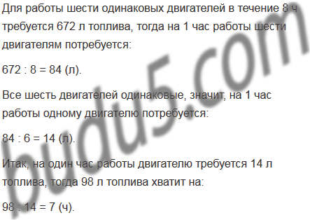 Для работы шести одинаковых двигателей в течение 8 ч требуется 672 л топлива. На сколько часов работы хватит 98 л топлива одному такому двигателю?