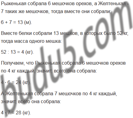 Белочки Рыженькая и Желтенькая собирали орехи. Рыженькая собрала 6 мешочков орехов, а Желтенькая - 7 таких же мешочков. Вместе они собрали 52 кг орехов. Сколько килограммов орехов собрала Рыженькая и сколько - Желтенькая?