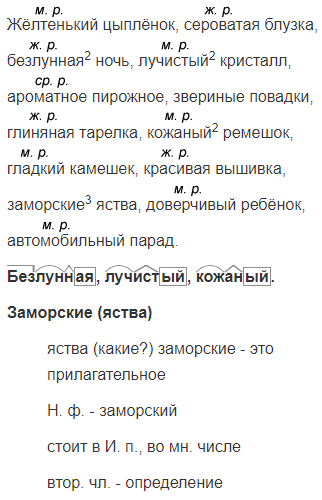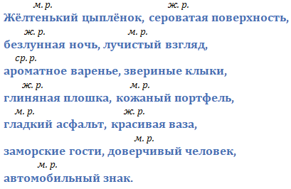 • Составьте и запишите словосочетания с каждым именем прилагательным. Над именами прилагательными в единственном числе укажите род. Проверьте себя.
