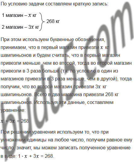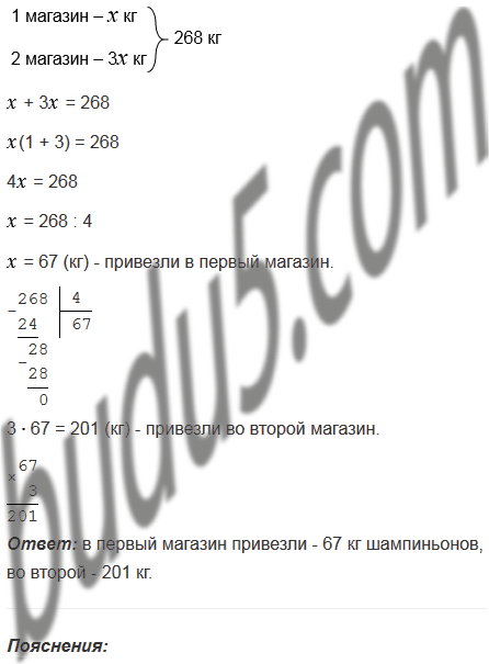 В два магазина завезли 268 кг шампиньонов, причем в первый магазин завезли шампиньонов в 3 раза меньше, чем во второй. Сколько килограммов шампиньонов завезли в каждый магазин?