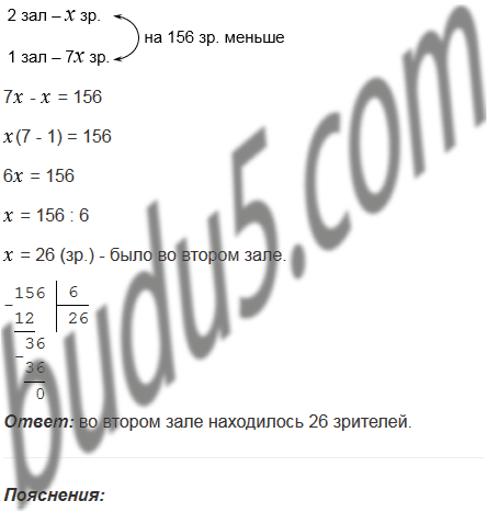 В двух залах кинотеатра демонстрировались два кинофильма. В первом зале зрителей было в 7 раз больше, чем во втором. Сколько зрителей находилось во втором зале, если известно, что их было на 156 меньше, чем в первом?