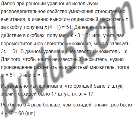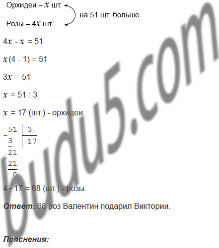 Валентин подарил Виктории розы и орхидеи, причем орхидей было в 4 раза меньше, чем роз. Сколько роз подарил Валентин, если известно, что их было на 51 больше, чем орхидей?