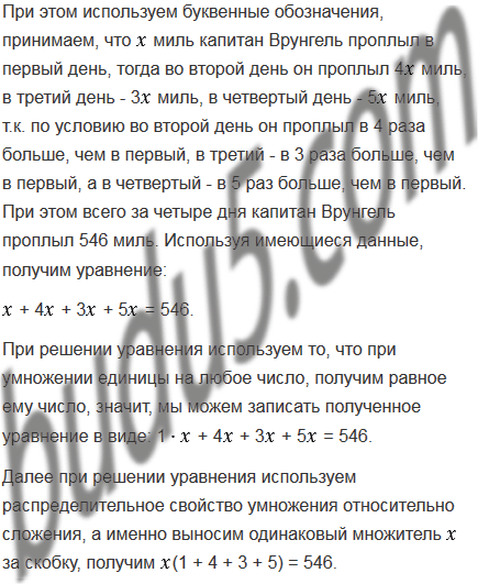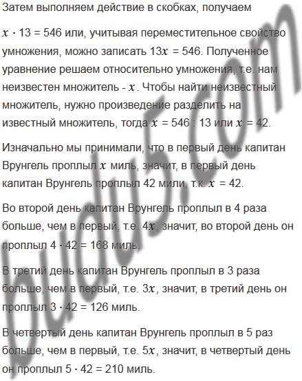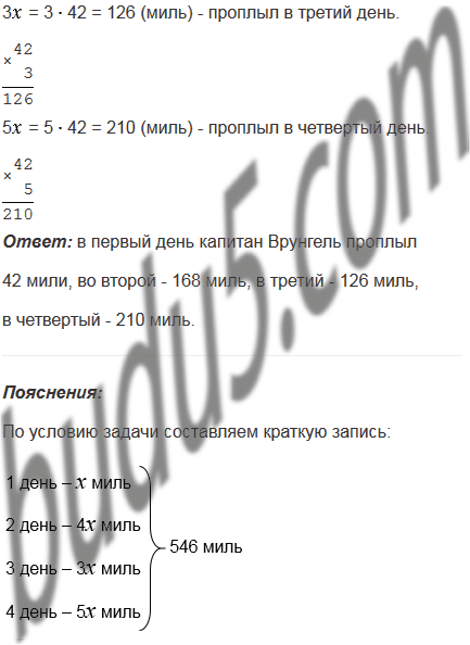 За четыре дня путешествия капитан Врунгель проплыл 546 миль. Во второй день он проплыл в 4 раза больше, чем в первый, в третий - в 3 раза больше, чем в первый, а в четвертый - в 5 раз больше, чем в первый. Сколько миль проплывал капитан Врунгель ежедневно?