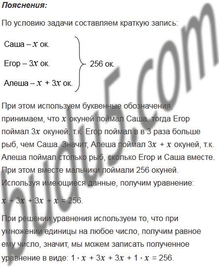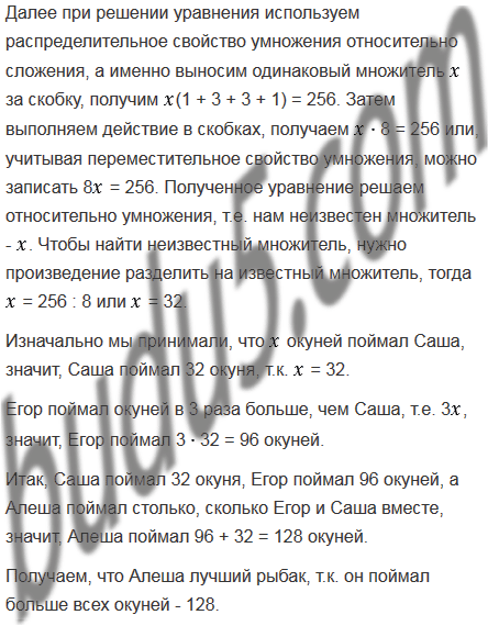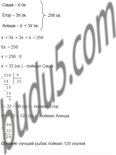 Егор, Саша и Алеша поймали 256 окуней. Егор поймал в 3 раза больше рыб, чем Саша, а Алеша - столько, сколько Егор и Саша вместе. Сколько окуней поймал лучший рыбак?