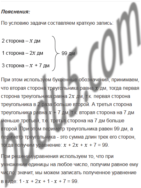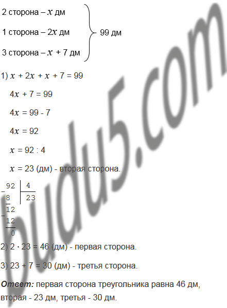 Одна из сторон треугольника в 2 раза больше второй стороны, а вторая на 7 дм меньше третьей. Найдите стороны треугольника, если его периметр равен 99 дм.