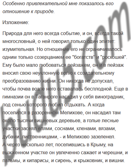 Ещё раз перечитайте текст об А. П. Чехове. Какая черта характера писателя вас особенно привлекла? Проследите, как развёрнута в тексте эта часть характеристики. Напишите по этой части подробное изложение.