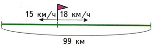 Из одного посёлка в противоположных направлениях одновременно выехали два велосипедиста. Скорость движения первого 15 км/ч, второго 18 км/ч. Через какое время велосипедисты будут друг от друга на расстоянии 99 км?