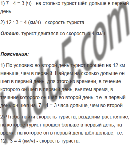 В первый день турист был в дороге 7 ч, а во второй - 4 ч, двигаясь с такой же скоростью, как и в первый день. Во второй день турист прошёл на 12 км меньше, чем в первый. С какой скоростью двигался турист?
