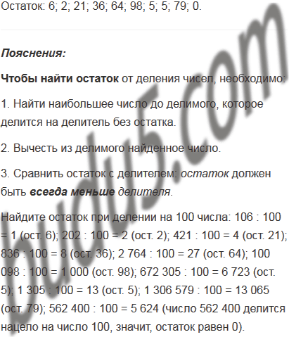 Найдите остаток при делении на 100 числа: 106; 202; 421; 836; 2 764; 100 098; 672 305; 1 305; 1 306 579; 562 400.