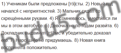 1) Ученикам были предложены [т’э́]сты. 2) Новый год на́чался с неприятностей. 3) Мальчик сидел со скре́щенными руками. 4) Я сомневаюсь, уме́стимся ли мы в этом автобусе. 5) Девочка не по годам ра́звита. 6) Докладчик выдвинул [т’э́]зис и убедительно доказал его. 7) Наро[ч’н]о не придумаешь. 8) Новая книга воспри́нята положительно.