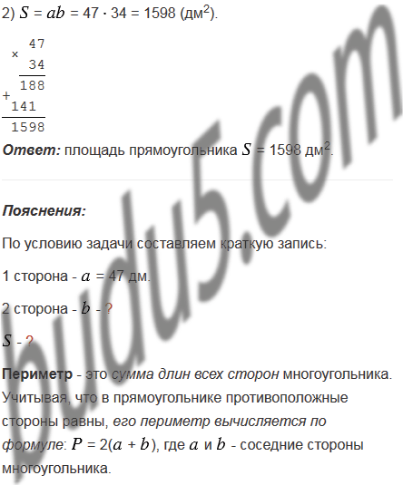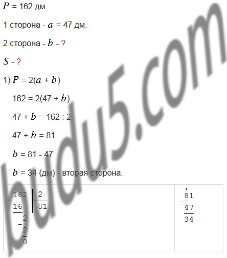 Периметр прямоугольника равен 162 дм, а одна из сторон - 47 дм. Найдите площадь прямоугольника.