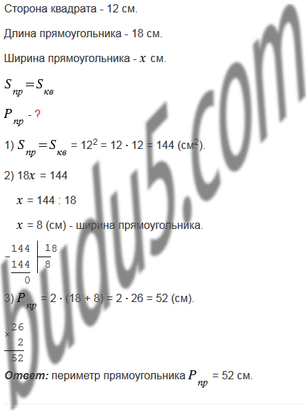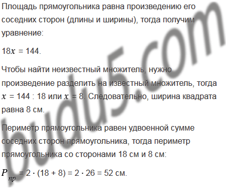 Квадрат со стороной 12 см и прямоугольник, длина которого равна 18 см, имеют равные площади. Найдите периметр прямоугольника.